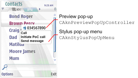 A stylus pop up menu ( CAknStylusPopUpMenu , defined in AknStylusPopUpMenu.h ) is a floating menu component that contains stylus-specific menu content. As the name implies, the stylus pop up menu is meant to be used only with the stylus by tapping a stylus interactive area. The pop-up menu is displayed near the tapping position.