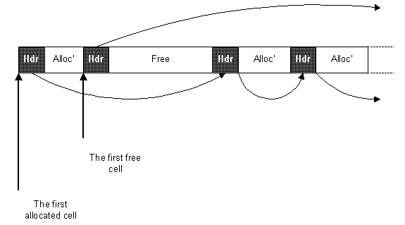 A heap simply consists of two lists of cells; one is the list of allocated cells and the other the list of free cells. Each list is anchored in the heap object.