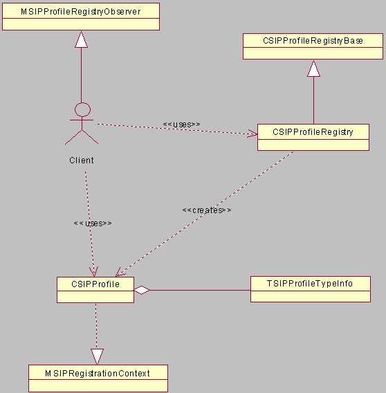 The client must create a CSIP object, and must implement the callback functions defined by the MSIPProfileRegistryObserver class. A client of the SIP Profile API must then create a CSIPProfileRegistry object.