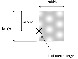 A text cursor ( TTextCursor ) is a rectangular area which can optionally be set to flash. It has a height, width, ascent and origin, illustrated below.