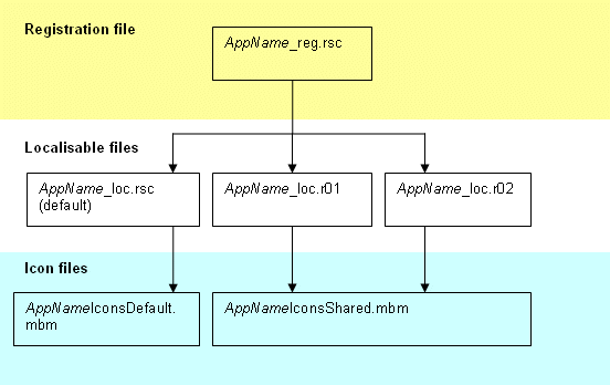 A registration file which 'points' to one of three localizable resource files provided. If the current language is 01 or 02 , the system will load the corresponding version of AppName_loc , otherwise AppName_loc.rsc will be loaded.