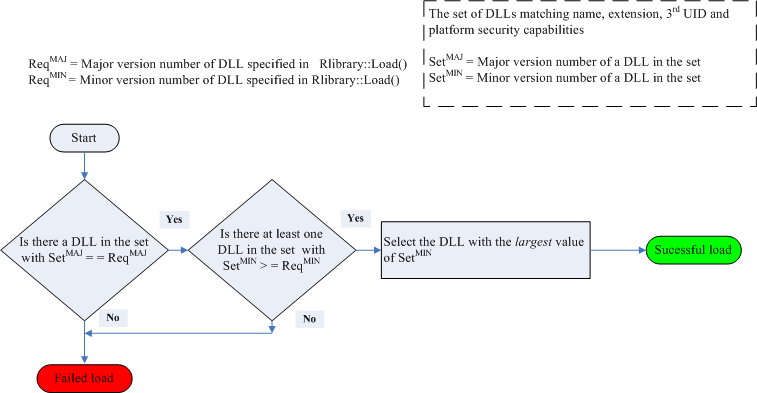 If you specify a version number in RLibrary::Load() , the loader selects a version of the DLL from the set. The following flowchart shows how the loader selects the DLL from the set of possible DLLs.