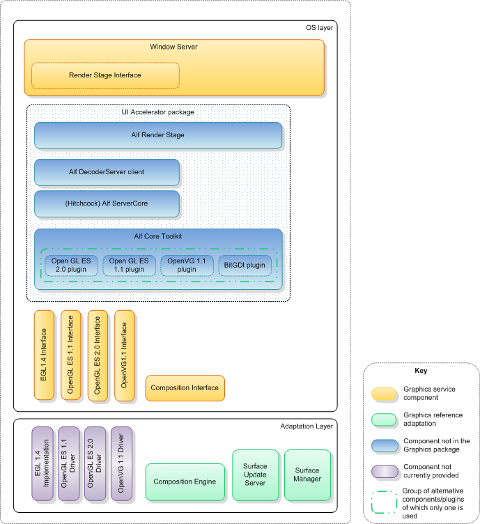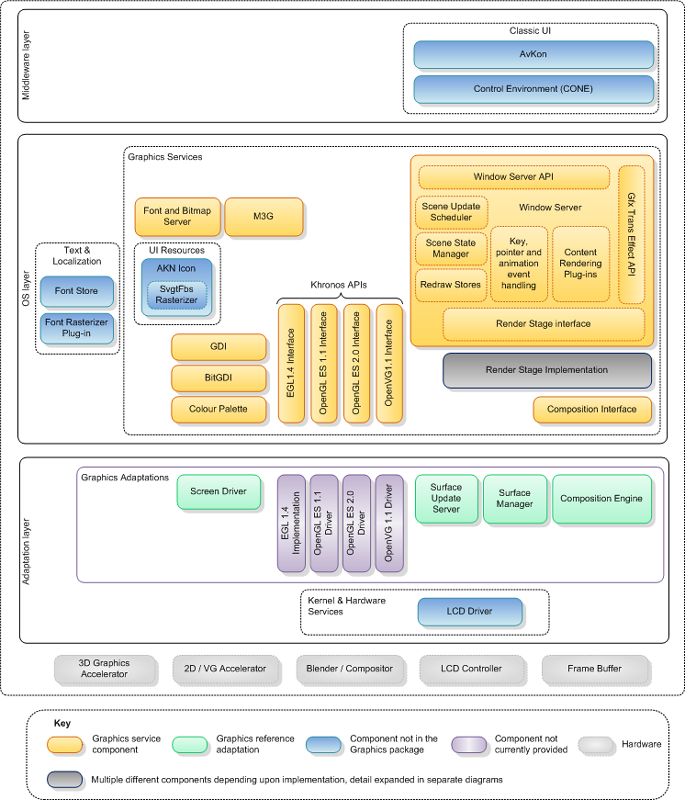 Symbian provides more than one render stage solution. The following diagram provides a simplified representation of one possible solution (called solution A in this topic). This solution is full featured. The diagram focuses on the more relevant components and does not attempt to show all components in the complete solution. This solution has a dependency on the S60 middleware layer, in particular on the Hitchcock component (which is in the UI Accelerator package).