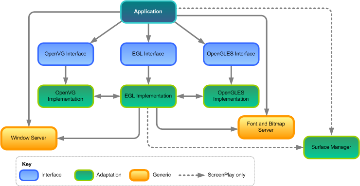 The following diagram shows the key EGL relationships and dependencies within the Symbian platform. On the Symbian platform, OpenGL ES, OpenVG and EGL all have a component (shown in blue) that declares the interface, and all require an implementation that implements that interface (shown in green).