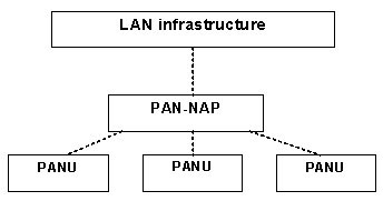 A PAN-NAP device plays the role of a proxy, bridge, or a router between an existing network say a LAN or the Internet and Bluetooth-enabled devices. The PAN-NAP device takes up to seven active wireless clients. The NAP device acts as a bridge between PANU devices or bluetooth networks and other networks for routing ethernet packets. The Symbian platform PAN-NAP role allows only a single PANU client access to the uplink for the external network.