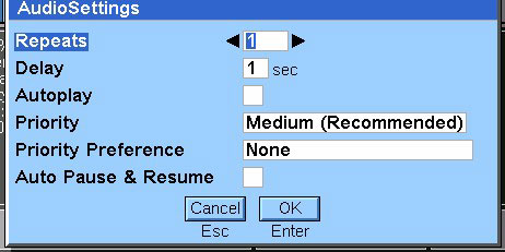In the Settings menu, click Audio . The Audio Settings dialog box is displayed.
