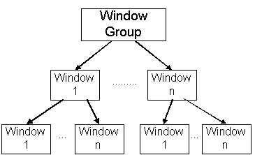 The following diagram shows the relationship between parent and child windows and window groups at run-time. Arrows indicate "is a parent of".