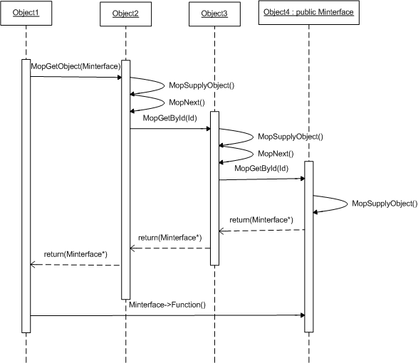 Object1 wishes to call a function on MInterface . It calls MopGetObject() on the nearest control in the run-time hierarchy. The Object Provider Framework identifies the Uid for Minterface and then passes the request up the hierarchy until an object is found (Object4) that implements Minterface .