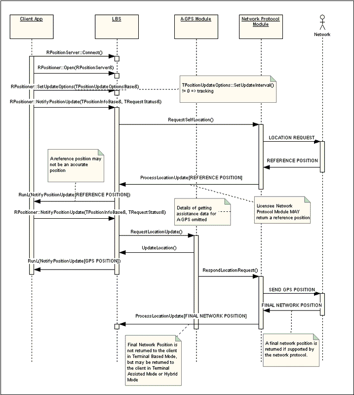 Figure 1 shows a simplified sequence for a client requesting a position update from LBS. The sequence shows simplified behaviour for Terminal Based Mode. The A-GPS Module is a Positioning Module that uses Assisted GPS to calculate a position. The Network Protocol Module is a Positioning Module that obtains GPS assistance data and reference positions (often approximate positions) from the network. Note that Terminal Based Mode may not be available on all mobile devices. This depends on the Positioning Modules that have been installed by the mobile device creator.
