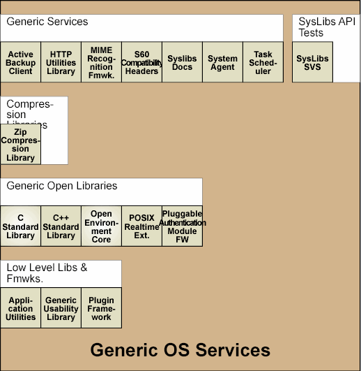 The Generic OS Services module is a group of non-related components and libraries that provide OS level services to other components of the Symbian platform. The components and libraries in Generic OS Services are grouped into the following collections: