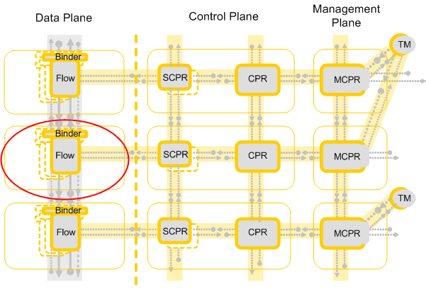 A CF Protocol is a collection of components on the Data Plane, most importantly the Flow and the Binder(s). The Flow is a Node and communicates with the SCPR that caused it to be started, using the asynchronous Message Transport mechanism. Each Flow has one or more Binders which connect the Flow to the layer above.