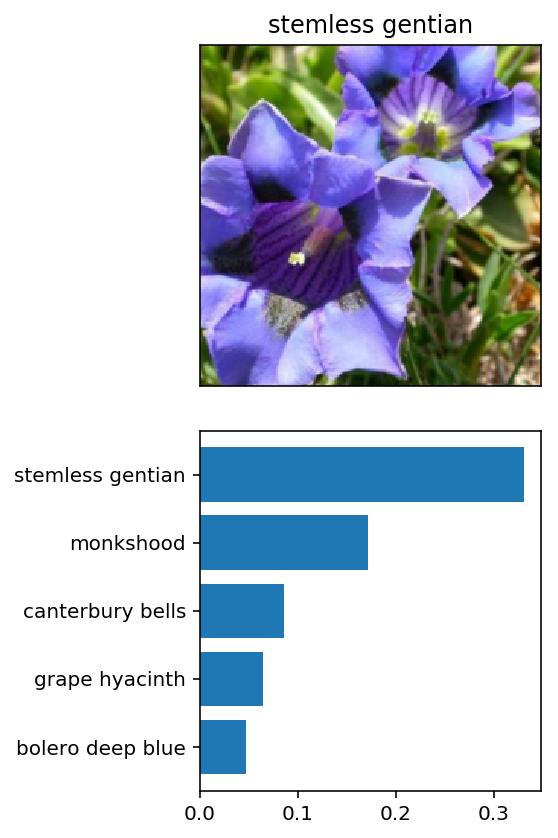 "Now that you can use a trained model for predictions, check to make sure it makes sense. Even if the testing accuracy is high, it's always good to check that there aren't obvious bugs. Use `matplotlib` to plot the probabilities for the top 5 classes as a bar graph, along with the input image. It should look like this:\n",