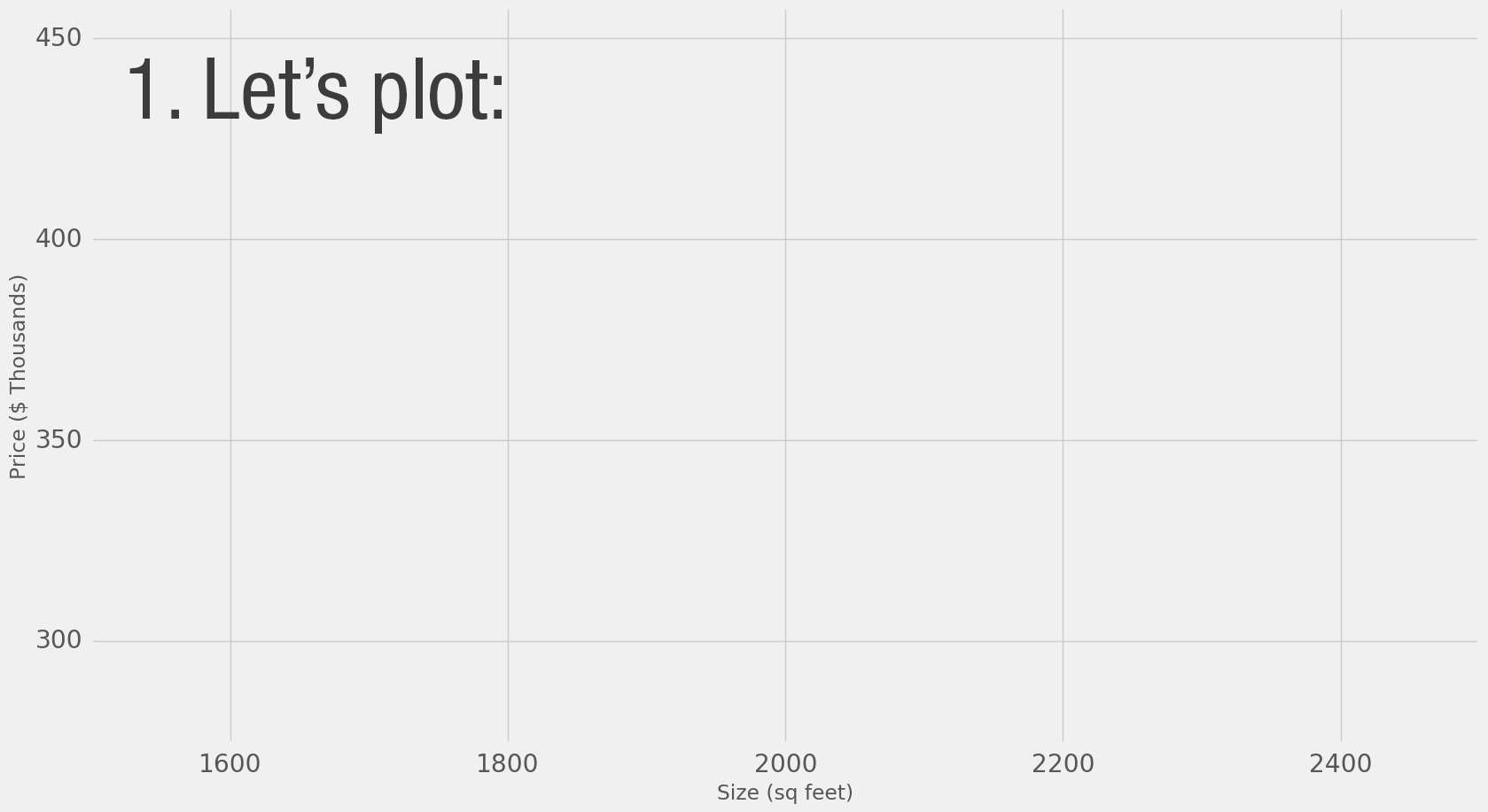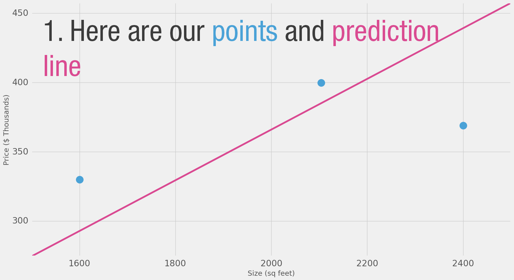 " ] }, "metadata": { "needs_background": "light" }, "output_type": "display_data" } ], "source": [ "x_train = np.array([[2104],[1600],[2400]], dtype=np.float32)\n", "y_train = np.array([[399.900], [329.900], [369.000]], dtype=np.float32)\n", "\n", "plt.plot(x_train, y_train, 'r.')\n", "plt.show()" ] }, { "cell_type": "code", "execution_count": 69, "metadata": { "ExecuteTime": { "end_time": "2020-05-24T07:17:05.263887Z", "start_time": "2020-05-24T07:17:05.258498Z" }, "slideshow": { "slide_type": "subslide" } }, "outputs": [], "source": [ "x_train = torch.from_numpy(x_train)\n", "y_train = torch.from_numpy(y_train)" ] }, { "cell_type": "markdown", "metadata": { "ExecuteTime": { "end_time": "2019-04-07T04:47:17.479477Z", "start_time": "2019-04-07T04:47:17.468259Z" }, "slideshow": { "slide_type": "subslide" } }, "source": [ "**nn.Linear**\n", "\n", "> help(nn.Linear)\n", "\n", "Applies a linear transformation to the incoming data: $y = xA^T + b$\n", "\n", "- **in_features**: size of each input sample\n", "- **out_features**: size of each output sample\n", "- **bias**: If set to False, the layer will not learn an additive bias. Default: ``True``" ] }, { "cell_type": "code", "execution_count": 70, "metadata": { "ExecuteTime": { "end_time": "2020-05-24T07:17:06.464409Z", "start_time": "2020-05-24T07:17:06.458690Z" }, "slideshow": { "slide_type": "subslide" } }, "outputs": [], "source": [ "# Linear Regression Model\n", "class LinearRegression(nn.Module):\n", " def __init__(self):\n", " super(LinearRegression, self).__init__()\n", " self.linear = nn.Linear(1, 1) # input and output is 1 dimension\n", "\n", " def forward(self, x):\n", " out = self.linear(x)\n", " return out\n", "\n", "model = LinearRegression()" ] }, { "cell_type": "code", "execution_count": 71, "metadata": { "ExecuteTime": { "end_time": "2020-05-24T07:17:07.149424Z", "start_time": "2020-05-24T07:17:07.146247Z" }, "slideshow": { "slide_type": "subslide" } }, "outputs": [], "source": [ "# Define Loss and Optimizatioin function\n", "criterion = nn.MSELoss()\n", "optimizer = optim.SGD(model.parameters(), lr=1e-9)#1e-4)" ] }, { "cell_type": "markdown", "metadata": { "ExecuteTime": { "end_time": "2019-06-20T13:07:42.012941Z", "start_time": "2019-06-20T13:07:42.003484Z" }, "slideshow": { "slide_type": "subslide" } }, "source": [ "> help(nn.MSELoss)\n", "\n", "To measures the **mean squared error** (squared L2 norm) between each element in the input `x` and target `y`.\n", "\n", "> help(optim.SGD)\n", "\n", "Implements **stochastic gradient descent** (optionally with momentum).\n", "\n", "Momentum is a variation on stochastic gradient descent that takes previous updates into account as well and generally leads to faster training." ] }, { "cell_type": "code", "execution_count": 72, "metadata": { "ExecuteTime": { "end_time": "2020-05-24T07:17:08.856804Z", "start_time": "2020-05-24T07:17:08.642890Z" }, "slideshow": { "slide_type": "subslide" } }, "outputs": [ { "name": "stdout", "output_type": "stream", "text": [ "Epoch[50/1000], loss: 524703.812500\n", "Epoch[100/1000], loss: 224658.125000\n", "Epoch[150/1000], loss: 96851.820312\n", "Epoch[200/1000], loss: 42411.964844\n", "Epoch[250/1000], loss: 19222.966797\n", "Epoch[300/1000], loss: 9345.485352\n", "Epoch[350/1000], loss: 5138.111816\n", "Epoch[400/1000], loss: 3345.956299\n", "Epoch[450/1000], loss: 2582.575439\n", "Epoch[500/1000], loss: 2257.412354\n", "Epoch[550/1000], loss: 2118.905518\n", "Epoch[600/1000], loss: 2059.905518\n", "Epoch[650/1000], loss: 2034.777222\n", "Epoch[700/1000], loss: 2024.072266\n", "Epoch[750/1000], loss: 2019.512207\n", "Epoch[800/1000], loss: 2017.569946\n", "Epoch[850/1000], loss: 2016.742554\n", "Epoch[900/1000], loss: 2016.390259\n", "Epoch[950/1000], loss: 2016.241577\n", "Epoch[1000/1000], loss: 2016.177734\n" ] } ], "source": [ "num_epochs = 1000\n", "for epoch in range(num_epochs):\n", " inputs = Variable(x_train)\n", " target = Variable(y_train) \n", " # forward\n", " out = model(inputs)\n", " loss = criterion(out, target)\n", " # backward\n", " optimizer.zero_grad() # Clears the gradients of all optimized\n", " loss.backward()\n", " optimizer.step() # Performs a single optimization step.\n", "\n", " if (epoch+1) % 50 == 0:\n", " print('Epoch[{}/{}], loss: {:.6f}'\n", " .format(epoch+1, num_epochs, loss.data.item()))\n" ] }, { "cell_type": "code", "execution_count": 73, "metadata": { "ExecuteTime": { "end_time": "2020-05-24T07:17:10.284215Z", "start_time": "2020-05-24T07:17:10.002466Z" }, "slideshow": { "slide_type": "subslide" } }, "outputs": [ { "data": { "image/png": "iVBORw0KGgoAAAANSUhEUgAAAZAAAAESCAYAAADTx4MfAAAABHNCSVQICAgIfAhkiAAAAAlwSFlzAAALEgAACxIB0t1+/AAAADh0RVh0U29mdHdhcmUAbWF0cGxvdGxpYiB2ZXJzaW9uMy4xLjMsIGh0dHA6Ly9tYXRwbG90bGliLm9yZy+AADFEAAAgAElEQVR4nO3dd3gUZdfH8W96CCmQAqGFIuQO0qtIFUSxgIUmgiJIURGVR3wVFRWsWB4bivIAUgQEESwoKEgv0olIuykCoZcECAmk7r5/zGZJIIHskuxskvO5Li+Z2ZmdX7KbPTvt3B5WqxUhhBDCUZ5mBxBCCFE0SQERQgjhFCkgQgghnCIFRAghhFOkgAghhHCKt9kBXMQPaAYcBzJNziKEEEWFF1AB2AikXvlgSSkgzYBVZocQQogiqg2w+sqZJaWAHAc4ezYZi8Xx+17CwgKJj08q8FA3yl1zgftmk1yOkVyOKW65PD09KFu2NNg+Q69UUgpIJoDFYnWqgGSt647cNRe4bzbJ5RjJ5ZhimivXQ/9yEl0IIYRTpIAIIYRwihQQIYQQTpECIoQQwikl5SS6EEKUKMPGriYxOe2q+cGlffn0mdYFsg3ZAxFCiGIot+JxrfnOkAIihBDCKVJAhBCimDmfdFXXkUIh50CEEKKYsFqtrPnnBLOX7nXJ9tyigCilPgLCtdb9lFL3A6MBD+AA0F9rfVYpFQVMB8oBGuijtXa/ngFCCGGCM+cuMfUPzY4DCdSqHMLeI+cLfZumH8JSSt0OPGb7dzDwFXCv1roBsA0YZVt0HDBOax0DbAJec31aIYRwLxarlT83Hea1SRvYd/Q8j9wZzUt9GhNc2jfX5fOa7wxT90CUUqHAO8C7QAPAB3haa33Utsg2oI9SygdoCzxgmz8FWAG85NLAQgjhRo6dSWbKwt3sO3qeujVC6dtJER5SCiDHpboREUGcPn2hwLdv9iGs8cCrQBUArXU88COAUqoUMAIYC4QDiVrrDNt6x4HKLk8rhBBuICPTwu/r4/hlzQH8fLwY2Lk2t9aJxMPDw6U5TCsgSqmBwGGt9RKlVL8rHgvBKCR/a62nKqUqAVe2krQ4us2wsEBn4xIREeT0uoXJXXOB+2aTXI6RXI4p7Fz7jpxj7OxY/j12nlYNKvLEg/UoG+RvSi4z90AeAioopWKBUCBQKfUJ8AHwB7AU+I9t2VNAiFLKS2udiTFC1jFHNxgfn+RUS+PC2v27Ue6aC9w3m+RyjORyTGHmSkvP5Jc1B/l9fRxBAT48/WA9mqgIMlLSOZ2SXii5PD09rvnF27QCorW+I+vftj2Q24AXgPXA91rrt7Mtm66UWoVRdGYCfYGFrswrhBBm2XP4HJMX7uZkwkXa1K9Az