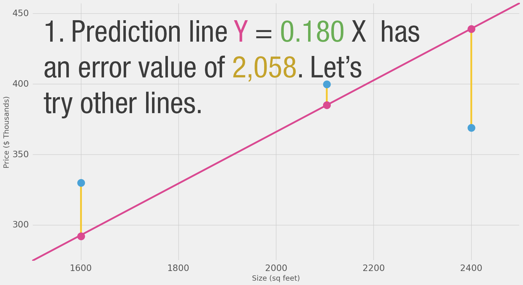 " ] }, "metadata": {}, "output_type": "display_data" } ], "source": [ "%matplotlib inline\n", "import matplotlib.pyplot as plt\n", "import numpy as np\n", "import seaborn as sns\n", "sns.set()\n", "\n", "x_data = [1.0, 2.0, 3.0]\n", "y_data = [2.0, 4.0, 6.0]\n", "\n", "plt.plot(x_data, y_data, 'r-o');" ] }, { "cell_type": "code", "execution_count": 10, "metadata": { "ExecuteTime": { "end_time": "2020-08-13T03:38:14.210339Z", "start_time": "2020-08-13T03:38:14.207126Z" }, "slideshow": { "slide_type": "subslide" } }, "outputs": [], "source": [ "# our model for the forward pass\n", "def forward(x):\n", " return x * w\n", "\n", "# Loss function\n", "def loss(y_pred, y_val):\n", " return (y_pred - y_val) ** 2\n" ] }, { "cell_type": "code", "execution_count": 11, "metadata": { "ExecuteTime": { "end_time": "2020-08-13T03:38:14.860718Z", "start_time": "2020-08-13T03:38:14.855815Z" }, "slideshow": { "slide_type": "subslide" } }, "outputs": [], "source": [ "# List of weights/Mean square Error (Mse) for each input\n", "w_list = []\n", "mse_list = []\n", "\n", "for w in np.arange(0.0, 4.1, 0.1):\n", " # Print the weights and initialize the lost\n", " #print(\"w=\", w)\n", " l_sum = 0\n", " for x_val, y_val in zip(x_data, y_data):\n", " # For each input and output, calculate y_hat\n", " # Compute the total loss and add to the total error\n", " y_pred = forward(x_val)\n", " l = loss(y_pred, y_val)\n", " l_sum += l\n", " #print(\"\\t\", x_val, y_val, y_pred_val, l)\n", " # Now compute the Mean squared error (mse) of each\n", " # Aggregate the weight/mse from this run\n", " #print(\"MSE=\", l_sum / 3)\n", " w_list.append(w)\n", " mse_list.append(l_sum / 3)" ] }, { "cell_type": "code", "execution_count": 12, "metadata": { "ExecuteTime": { "end_time": "2020-08-13T03:38:15.764701Z", "start_time": "2020-08-13T03:38:15.525889Z" }, "slideshow": { "slide_type": "subslide" } }, "outputs": [ { "data": { "image/png": "iVBORw0KGgoAAAANSUhEUgAAAYoAAAEJCAYAAACKWmBmAAAABHNCSVQICAgIfAhkiAAAAAlwSFlzAAALEgAACxIB0t1+/AAAADh0RVh0U29mdHdhcmUAbWF0cGxvdGxpYiB2ZXJzaW9uMy4xLjMsIGh0dHA6Ly9tYXRwbG90bGliLm9yZy+AADFEAAAgAElEQVR4nO3deVhTV94H8G9Cwr5D2PdFQFkVd4WisiggrbZWa6vWse10bJ1xZuxYnakd39r2rba2vrZTp+3beTvahWoRpUpVtG64orIooiJbACHsBAiE5L5/WDNSNBAkuTfh93mePg/JyTVfDpRf7rnnnsNjGIYBIYQQ8hB8tgMQQgjhNioUhBBC1KJCQQghRC0qFIQQQtSiQkEIIUQtKhSEEELUokJBCCFELQHbAbShubkDSqXmt4c4OFiisVGqhUSPhqu5AO5mo1yaoVyaMbRcfD4PdnYWD203yEKhVDJDKhT3juUiruYCuJuNcmmGcmlmJOWioSdCCCFqUaEghBCiFhUKQgghalGhIIQQohYVCkIIIWpRoSCEEKIWFYpfiCVSvPj2ETS0dLEdhRBCNNKrUGLjvy7g5JVqrfz7VCh+YWEqRF1TB47n17AdhRBCNHLlZgPK77TDzEQ7t8ZRofiFnZUJxoU441RBLXoVSrbjEELIoJ3Ir4G9tQmigpy08u9TobhP4kRvtHb0oKC0ke0ohBAyKA0tXbha1oRpYa4w4vO08h5UKO4THeIMW0tjnKDhJ0KInjhRUAsAmB7uprX3oEJxHyMjPqaFu6LwdiOa2mRsxyGEELUUSiVOFdQg1M8BDjamWnsfKhS/Mj3cDQwDnPylShNCCFcVljahRdqDmAjtnU0AVCj6EdmaYYyPHU4W1HB2dUhCCAHuXsS2tjBGRICDVt+HCsUDxES6o6mtG0VldFGbEMJNze3dyC9twLQwVwiMtPunXOv7UUilUixcuBCffvopSktL8cEHH6ja6urqEBERgR07dvQ5JiMjA++//z4cHO5WycceewyrV6/WdlSVqEBHWJkLcfxKDcL9HXX2voQQMlinCmrAMEBMhKvW30urhSI/Px9//etfUV5eDgCIjY1FbGwsAEAikWDRokV4/fXX+x1XVFSEtWvXIiUlRZvxHkpgxMfUMFccOl+FFmk3bC1NWMlBCCEPomQYnCyoRYi3HZzszLX+flo9X0lPT8eGDRvg5NT/JpD33nsPCxcuhI+PT7+2wsJCZGRkIDU1FX/+85/R2tqqzZgPFBPhBiXD4HQhXdQmhHDLtfImNLTKEBup3YvY92i1UGzatAnR0dH9ni8vL8f58+exZMmSBx4nEonwu9/9Dvv27YOrqys2btyozZgP5GJvjiBPW5zIr4GSoYvahBDuOHGlBpZmQkQFinTyfqzsmf3dd9/hmWeegbGx8QPbP/74Y9XXK1asQHx8vEb/voOD5ZCziURWqq9Tpvvh/a8v4U5LNyJG6eYH8jD35+IarmajXJqhXJphK1dzuwyXbzYgdbof3Fxt+rVrIxcrhSInJwdffPHFA9va29uxZ88eLFu2DADAMAyMjIw0+vcbG6VDmtoqEllBImlXPR7lZgULUwH2nbgFNzvt3cyiaS4u4Wo2yqUZyqUZNnMdPFsBhZJBdKBjvwxDzcXn89R+wNb59NimpibIZDJ4eno+sN3c3Byff/458vPzAQA7d+7U+IxiuAgFRpg8xgWXbkjQ3tnDSgZCCLmHYRicyK9BoIcN3BwtdPa+Oi8UYrEYLi4u/Z5fv349cnJyYGRkhA8//BBvvvkmZs+ejatXr2LNmjW6jqkSE+mGXgWD3KI7rGUghBAAKKlsQV1zl9bvxP41nQw9HT16VPV1eHg40tPT+71m06ZNqq+jo6ORkZGhi2gD8hBZwt/NGifya5Aw3hM8nnZWZySEkIGcyK+BmYkA0cHaWU78YejO7EGIiXBDbWMnbop1P02XEEIAQNolx8USCSaPcYaJULPrto+KCsUgTAhxhqmxEY5foeXHCSHsOFN0B70Kpc6HnQAqFINiYnz3ovaF6/WQdsnZjkMIGWEYhsGxy9XwdbWGl7Pup+VSoRikuLHu6FUocbKAzioIIbpVXNGMO02dmDHWnZX3p0IxSB4iS4zytMWxS9V0pzYhRKeOXaqGpZkQE0J0exH7HioUGpgx1h0NrTIU3ablxwkhutHUdvdO7OnhrhAKdHsR+x4qFBoYO0oEGwtjHL1UzXYUQsgIcfxKDRiGwWNR7Aw7AVQoNCIw4iMmwg2FpY2QtHSxHYcQYuB6FUocz69BmL8DRLZmrOWgQqGh2Eg38Hg8/HyZzioIIdp16YYEbR09mDHWg9UcVCg0ZG9tiqhAR5wsqIW8V8F2HEKIATuaJ4bI1hShfvas5qBCMQQzxrpD2iXH+eJ6tqMQQgyUuF6KG+JWxEV5gM/y0kFUKIYg2NsOrg7mdFGbEKI1Ry9XQyjgY1q49vfEHggViiHg8XiIi3JHWW0bymrb2I5DCDEwXd29OFN0BxNCnGBpJmQ7DhWKoZoS6goToRGO0VkFIWSY5RbdQbdcwfpF7HuoUAyRuakAk8c441xxHa3/RAgZNgzD4OglMXxdreDras12HABUKB5J3FgPyHuVOFVQy3YUQoiBuF7ZgtrGTsRFceNsAqBC8Ug8nSwR6GGDny/T+k+EkOFx7JIYFqYC1tZ1ehAqFI8obqw76lu6cLWsie0ohBA919zejUs3GjA93A3GOt6cSB2tFwqpVIqUlBSIxWIAwOuvv46EhASkpaUhLS0Nhw8f7ndMcXEx5s2bh8TERKxfvx69vb3ajjlk0UFOsDYX0kVtQsgjO36l+pd1nXS/OZE6Wi0U+fn5WLRoEcrLy1XPFRUVYefOncjMzERmZibi4+P7HbdmzRq88cYb+Omnn8AwzAP32OYKgREfMZFuyL/VgAZa/4kQMkT31nUK9XOAk50523H60GqhSE9Px4YNG+DkdHesraurCzU1NVi3bh1SU1Oxbds2KJXKPsdUV1dDJpMhMjISADBv3jxkZ2drM+YjeyzSHTwej27AI4QMWV6JBK3SHtY2J1JHq4Vi06ZNiI6OVj1uaGjApEmT8PbbbyM9PR0XL17E7t27+xxTX18PkUikeiwSiVBXV6fNmI/M3toU44JEOJ5fA1kPd4fJCCHcxDAMDl2ogrOdGcL8HdiO049Al2/m6emJjz/+WPX4ueeew969e7FgwQLVc0qlErz71jVhGKbP48FwcLAcckaRaGj70S6ID8KF/zmJ/LJmpEzzG/L7P8xQc+kCV7NRLs1QLs0MZ67isiaU1bbht0+Ewdnp0e6d0EZ/6bRQlJSUoLy8HImJiQDuFgGBoG8EFxcXSCQS1eOGhgbV0NVgNTZKoVRqPl1VJLKCRNKu8XEA4GAhhJ+bNTJ+voXxoxyHdRGvR8mlbVzNRrk0Q7k0M9y50o+UwNxEgHBfu0f6d4eai8/nqf2ArdPpsQzD4O2330Zrayvkcjm+++67fhez3d3dYWJigry8PABAZmYmYmJidBlzyBLGe6K+uQsFt2irVELI4DS0diGvpB6xkW4wNdbpZ/dB02mhCA4OxosvvohFixYhOTkZISEhSElJAQC88MILKCwsBABs2bIF77zzDpKSktDZ2YklS5boMuaQjR0lgp2VCQ5dqGQ7CiFET+TkicEDDzPHcedO7F/TSfk6evSo6uvFixdj8eLF/V7z2Wefqb4ODg7ud5FbHwiM+Jg1zgPf/1yKyrp2eDlzc2yVEMINXd29OJFfi+hgEeytTdmO81B0Z/Ywi4l0g7GQj8MXq9iOQgjhuNOFtejq7kX8eE+2o6hFhWKYWZgKMTXMFeeu1aFV2s12HEIIRymVDI5cFMPfzRr+bjZsx1GLCoUWxEd7olfB4NhlugGPEPJg+aUNqG/p4vzZBECFQitc7M0R4e+AY5erIe9VsB2HEMJBhy9Uwd7aBOOCRAO/mGVUKLQkfrwn2jvlOHuV23eVE0J0r7KuHdcrWzBznAeM+Nz/M8z9hHoqxNsOHiJLHL5YBYb2qiCE3OfwhSqYCI0QG8