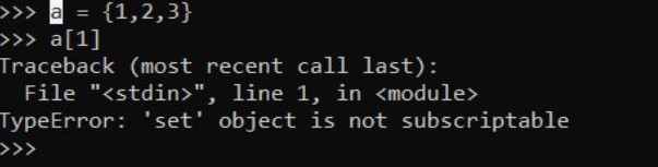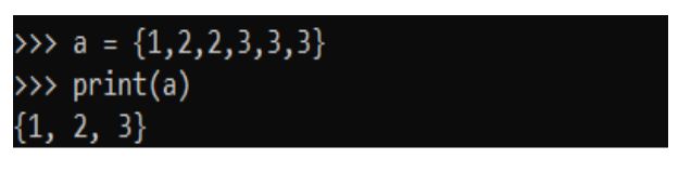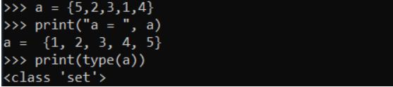 Set is an unordered collection of unique items. Set is defined by values separated by comma inside braces { } . Items in a set are not ordered.