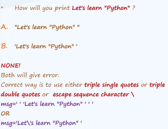 String is a sequence of Unicode characters. We can use single quotes or double quotes to represent strings. Multi-line strings can be denoted using triple quotes, ''' or """ .Python does not have a char data type , unlike C/C++ or Java. Unlike C language , Pyhton does not uses ASCII number system for character.It uses UNICODE number system.UNICODE is a number system which supports wider range of character compared to ASCII. As far as Python is concerned, it uses UNICODE supports 655536 characters with their numeric values ranging from 0 yo 65535 which covers almost every spoken language in the world like English,Greek,Germen,Korean,Chinese etc.