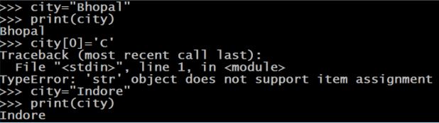 String objects in python are also immutable.That is , once we have created a String object, then we cannot overwrite it's value.Although we can change the value of the String refernce by assigning it new String.