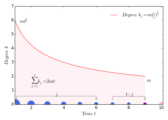 "** 那么到时间t的时候,网络的总节点数是$m_0 + t$,网络的总度数为$2mt$。\n",