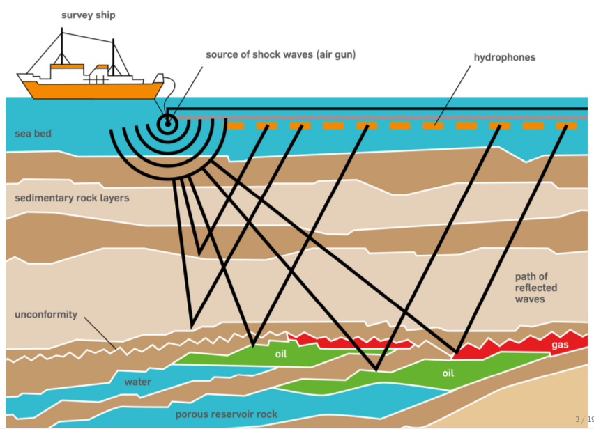 "- **Source** - A source is positioned at a single or a few physical locations where artificial pressure is injected into the domain we want to model. In the case of land survey, it is usually dynamite blowing up at a given location, or a vibroseis (a vibrating engine generating continuous sound waves). For a marine survey, the source is an air gun sending a bubble of compressed air into the water that will expand and generate a seismic wave.\n",