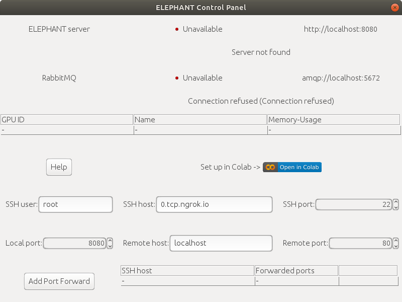 Click the `Add Port Forward` button to establish the connection to the ELEPHANT server. Click `yes` for a warning dialog and enter your password shown on Colab when asked for it.\