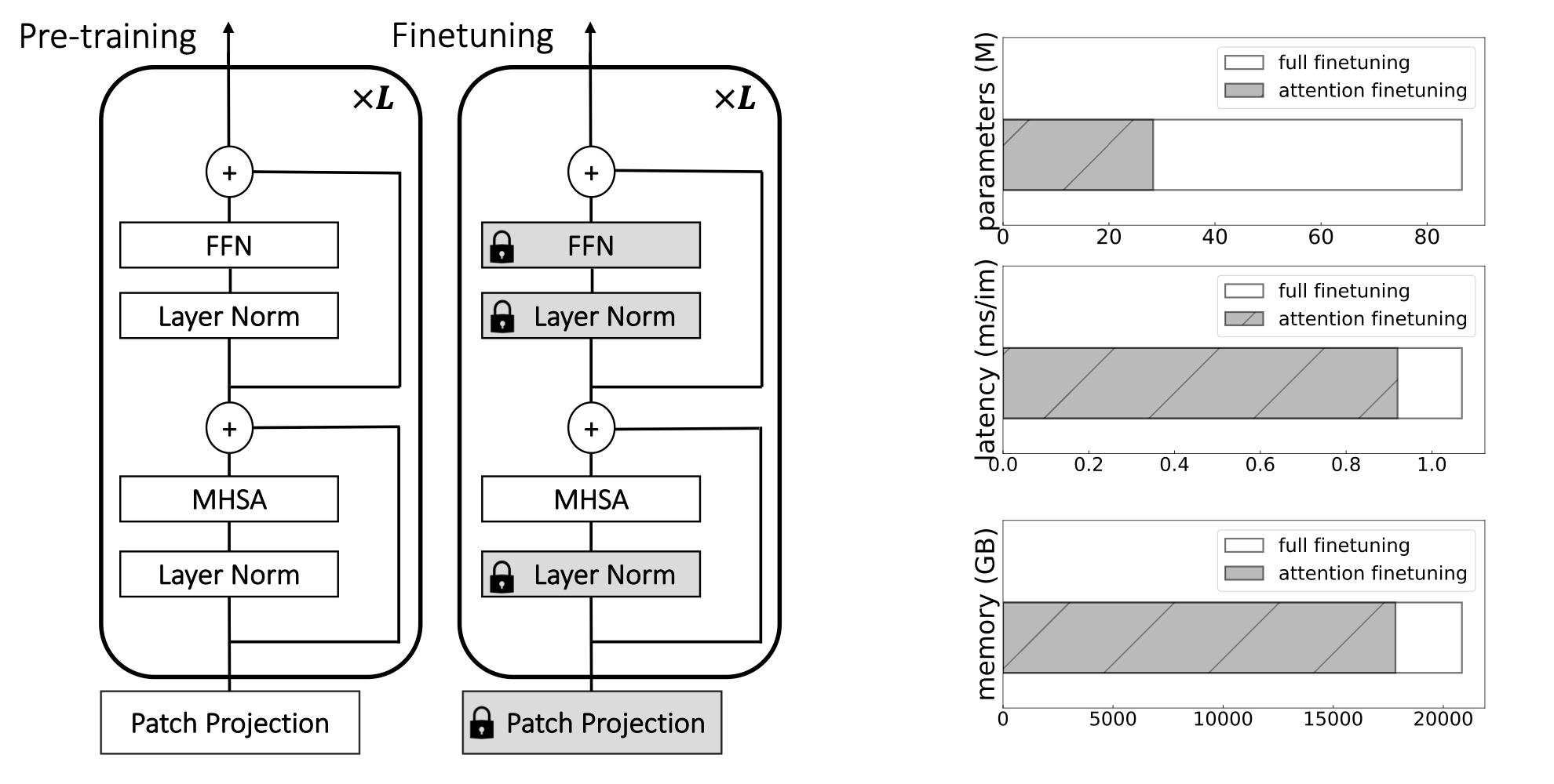 We propose to finetune only the attentions (flag ```--attn-only```) to adapt the models to higher resolutions or to do transfer learning.