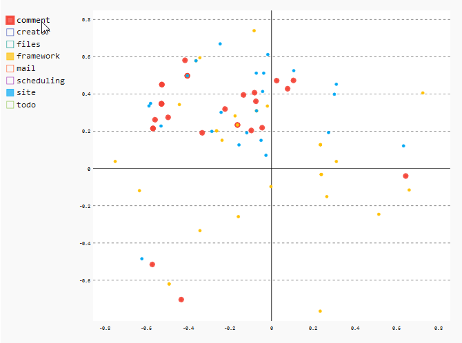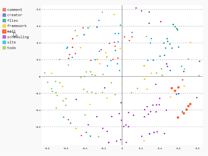 "As already seen in the heatmap, we can see that all files of the \"mail\" module are very close together. This means that the files changed together very often. \n",
