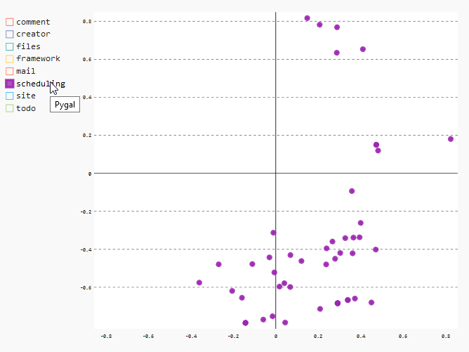 "Another interesting result can be found if we take a look at the distribution of the files of the module \"scheduling\". Especially the data points in the lower region of the chart indicate clearly that these files were changed almost exclusive together.\n",