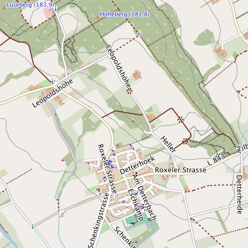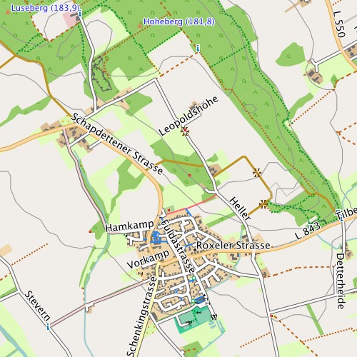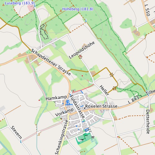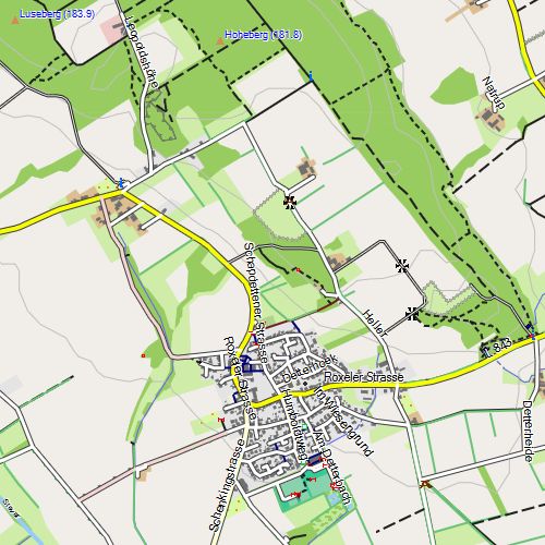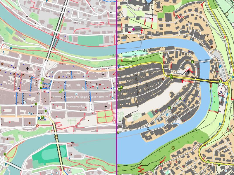 - Eigenschaften: Für viele Flächen werden eher "blasse" Farben mit "mittlerem" Kontrast verwendet. Straßen, Wege und wichtige Symbole werden "signifikanter" dargestellt. Insgesamt orientiert sich das Design am Mapnik-Stil der OpenStreetMap-Karte.