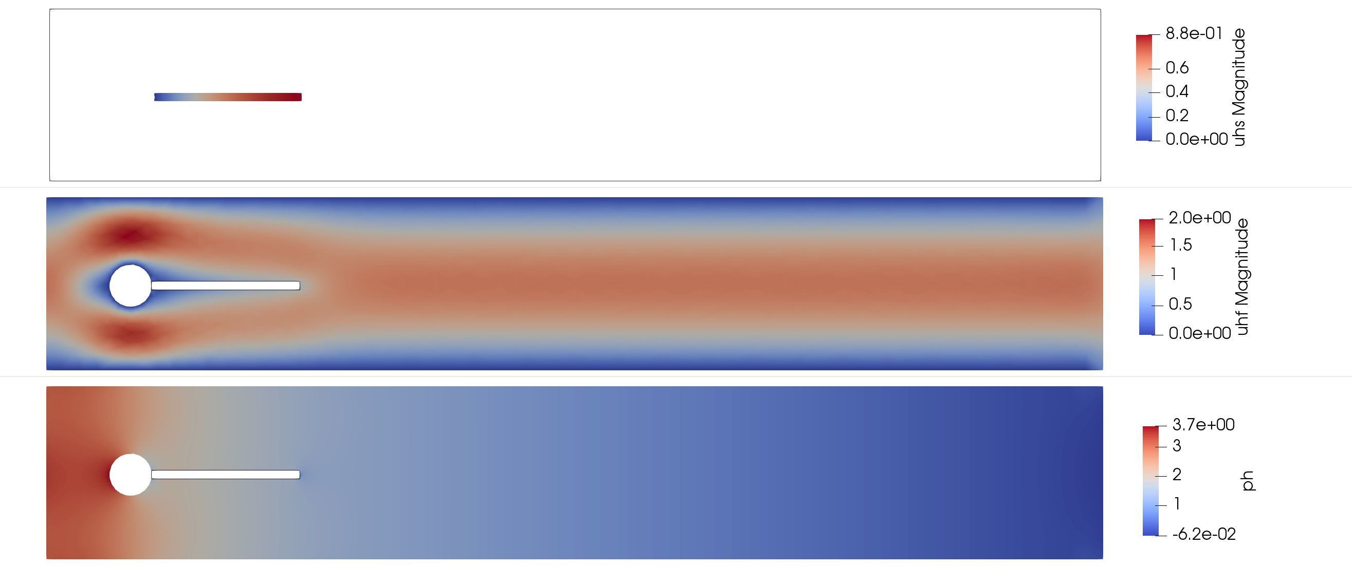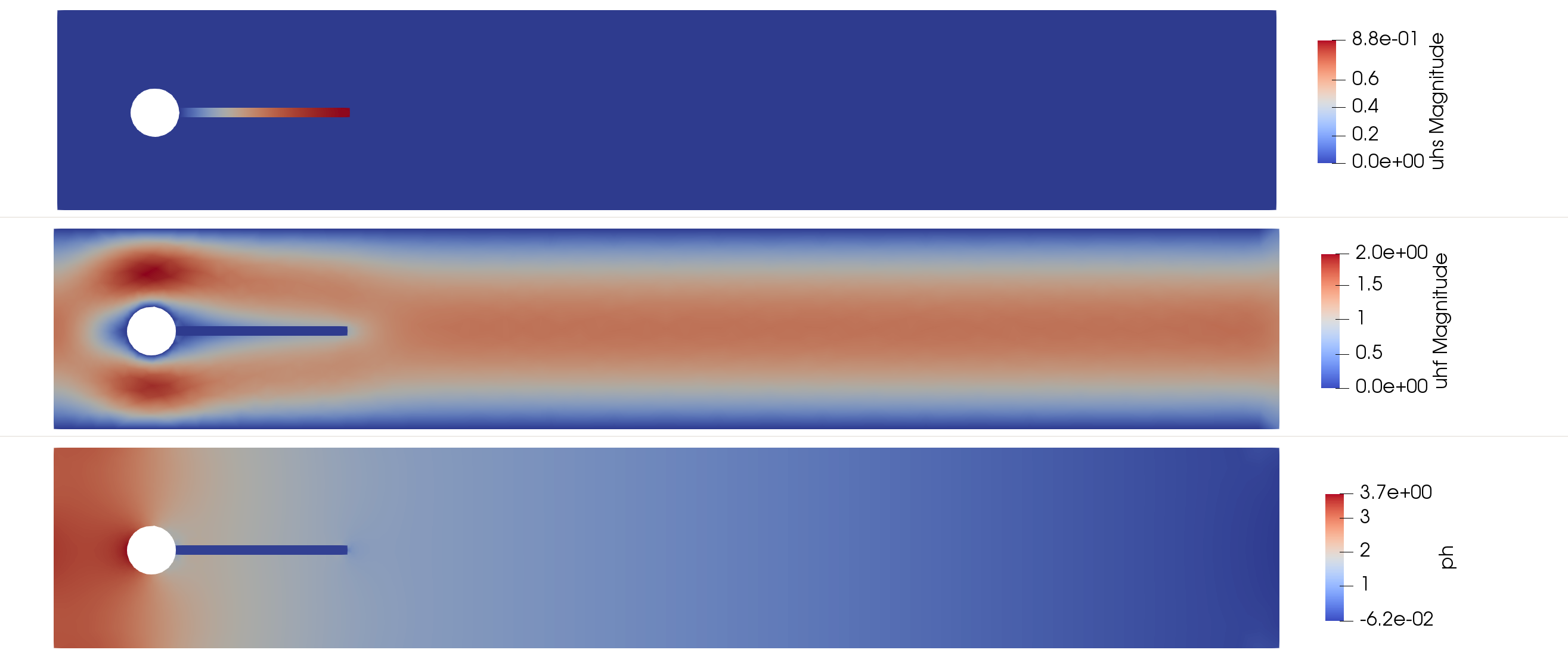 { "cells": [ { "cell_type": "markdown", "source": [ "# Tutorial 11: Fluid-Structure Interaction" ], "metadata": {} }, { "cell_type": "markdown", "source": [ "In this tutorial, we will learn\n", "\n", " - How to solve a surface-coupled multi-physics problem.\n", " - Construct FE spaces defined in different domains.\n", " - Define interface triangulations and integrate on them.\n", "\n", "1. [Problem Statement](#probStat)\n", " - [Strong form](#strongForm)\n", " - [Geometry and Discrete model](#geometry)\n", " - [Boundary conditions and properties](#conditions)\n", "2. [Numerical scheme](#numericalScheme)\n", " - [FE spaces](#feSpace)\n", " - [Weak form](#weakForm)\n", " - [Numerical integration](#integration)\n", " - [Algebraic system of equations](#algebraic)\n", "3. [Post-processing](#postprocess)\n", " - [Visualization](#visualization)\n", " - [Quantities of interest](#QOIs)" ], "metadata": {} }, { "cell_type": "markdown", "source": [ "```@raw HTML\n", "\n", "```\n", "## Problem statement\n", "```@raw HTML\n", "\n", "```\n", "### Strong form\n", " Let $\\Gamma_{\\rm FS}$ be the interface between a fluid domain $\\Omega_{\\rm F}$ and a solid domain $\\Omega_{\\rm S}$. We denote by $\\Gamma_{\\rm F,D}$ and $\\Gamma_{\\rm F,N}$ the fluid boundaries with Dirichlet and Neumann conditions, respectively.\n", "The Fluid-Structure Interaction (FSI) problem reads:\n", "\n", "find $u_{\\rm F}$, $p_{\\rm F}$ and $u_{\\rm S}$ such that\n", "$$\n", "\\left\\lbrace\n", "\\begin{aligned}\n", "-\\nabla\\cdot\\boldsymbol{\\sigma}_{\\rm F} = f &\\text{ in }\\Omega_{\\rm F},\\\\\n", "\\nabla\\cdot u_{\\rm F} = 0 &\\text{ in } \\Omega_{\\rm F},\\\\\n", "-\\nabla\\cdot\\boldsymbol{\\sigma}_{\\rm S} = s &\\text{ in }\\Omega_{\\rm S},\\\\\n", "\\end{aligned}\n", "\\right.\n", "$$\n", "\n", "satisfying the Dirichlet and Neumann boundary conditions\n", "$$\n", "\\left\\lbrace\n", "\\begin{aligned}\n", "u_{\\rm F} = g_{\\rm F} &\\text{ on } \\Gamma_{\\rm F,D},\\\\\n", "n_{\\rm F} \\cdot \\boldsymbol{\\sigma}_{\\rm F} = 0 &\\text{ on } \\Gamma_{\\rm F,N},\\\\\n", "u_{\\rm S} = g_{\\rm S} &\\text{ on } \\Gamma_{\\rm S,D},\\\\\n", "\\end{aligned}\n", "\\right.\n", "$$\n", "\n", "and the kinematic and dynamic conditions at the fluid-solid interface\n", "$$\n", "\\left\\lbrace\n", "\\begin{aligned}\n", "u_{\\rm F} = u_{\\rm S} &\\text{ on } \\Gamma_{\\rm FS},\\\\\n", "n_{\\rm F} \\cdot \\boldsymbol{\\sigma}_{\\rm F} + n_{\\rm S} \\cdot \\boldsymbol{\\sigma}_{\\rm S} = 0 &\\text{ on } \\Gamma_{\\rm FS}.\\\\\n", "\\end{aligned}\n", "\\right.\n", "$$\n", "\n", "Where $\\boldsymbol{\\sigma}_{\\rm F}(u_{\\rm F},p_{\\rm F})=2\\mu_{\\rm F}\\boldsymbol{\\varepsilon}(u_{\\rm F}) - p_{\\rm F}\\mathbf{I}$ and $\\boldsymbol{\\sigma}_{\\rm S}(u_{\\rm S})=2\\mu_{\\rm S}\\boldsymbol{\\varepsilon}(u_{\\rm S}) +\\lambda_{\\rm S}tr(\\boldsymbol{\\varepsilon}(u_{\\rm S}))\\mathbf{I}$." ], "metadata": {} }, { "cell_type": "markdown", "source": [ "```@raw HTML\n", "\n", "```\n", "### Geometry and Discrete model\n", "In this tutorial we solve the benchmark descrived in [1], consisting on a flow over an elastic flag after a cylinder.\n", "The computational domain is defined by a channel of size $\\Omega \\doteq (0,4.5)\\times(0,0.41)$, with an embedded cylinder of radius $R=0.05$ and center at $C=(0.2,0.2)$. The associated FE triangulation is denoted by $\\mathcal{T}$, the fluid and solid domain and their associated triangulations will be denoted by $\\Omega_{\\rm F}$, $\\Omega_{\\rm S}$, $\\mathcal{T}_{\\rm F}$ and $\\mathcal{T}_{\\rm S}$, respectively.\n", "\n", "In order to load the discrete model we first setup Gridap" ], "metadata": {} }, { "outputs": [], "cell_type": "code", "source": [ "using Gridap" ], "metadata": {}, "execution_count": null }, { "cell_type": "markdown", "source": [ "The discrete model for the elastic flag problem is generated by loading the `\"../models/elasticFlag.json\"` file." ], "metadata": {} }, { "outputs": [], "cell_type": "code", "source": [ "model = DiscreteModelFromFile(\"../models/elasticFlag.json\")" ], "metadata": {}, "execution_count": null }, { "cell_type": "markdown", "source": [ "We can inspect the loaded geometry and associated parts by printing to a `vtk` file:" ], "metadata": {} }, { "outputs": [], "cell_type": "code", "source": [ "writevtk(model,\"model\")" ], "metadata": {}, "execution_count": null }, { "cell_type": "markdown", "source": [ "This will produce an output in which we can identify the different parts of the domain, with the associated labels and tags.\n", "\n", "| Part | Notation | Label | Tag |\n", "| :---: | :---:| :---: | :---: |\n", "| Solid-cylinder wall | $\\Gamma_{\\rm S,D_{cyl}}$ | \"fixed\" | 1 |\n", "| Fluid-solid interface | $\\Gamma_{\\rm FS}$ | \"interface\" | 2 |\n", "| Channel inlet | $\\Gamma_{\\rm F,D_{in}}$ | \"inlet\" | 3 |\n", "| Channel outlet | $\\Gamma_{\\rm F,N_{out}}$ | \"outlet\" | 4 |\n", "| Channel walls | $\\Gamma_{\\rm F,D_{wall}}$ | \"noSlip\" | 5 |\n", "| Fluid-cylinder wall | $\\Gamma_{\\rm F,D_{cyl}}$ | \"cylinder\" | 6 |\n", "| Fluid domain | $\\Omega_{\\rm F}$ | \"fluid\" | 7 |\n", "| Solid domain | $\\Omega_{\\rm S}$ | \"solid\" | 8 |\n", "\n", "![](../assets/fsi/tags.png)" ], "metadata": {} }, { "cell_type": "markdown", "source": [ "```@raw HTML\n", "\n", "```\n", "### External conditions and properties\n", "#### Boundary conditions\n", "We apply Dirichlet boundary conditions at the channel inlet, upper and lower boundaries and on the cylinder. A parabolic profile is enforced at the channel inlet, while a no-slip condition is imposed on the remaining Dirichlet boundaries.\n", "$$\n", "\\left\\lbrace\n", "\\begin{aligned}\n", "u_{\\rm F,in}(x,y) = 1.5U\\frac{y(H −y)}{\\left(\\frac{H}{2}\\right)^2}\\quad&\\textrm{on }\\Gamma_{\\rm F,D_{in}},\\\\\n", "u_{\\rm F,0}(x,y) = [0, 0]\\quad&\\textrm{on }\\Gamma_{\\rm F,D_{wall}}\\cup\\Gamma_{\\rm F,D_{cyl}},\\\\\n", "u_{\\rm S,0}(x,y) = [0, 0]\\quad&\\textrm{on }\\Gamma_{\\rm S,D_{cyl}}.\\\\\n", "\\en