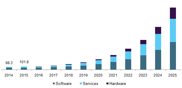 "The below chart shows how big the deep learning market is and the expected size of its future from the aspects of the software, hardware, and services."