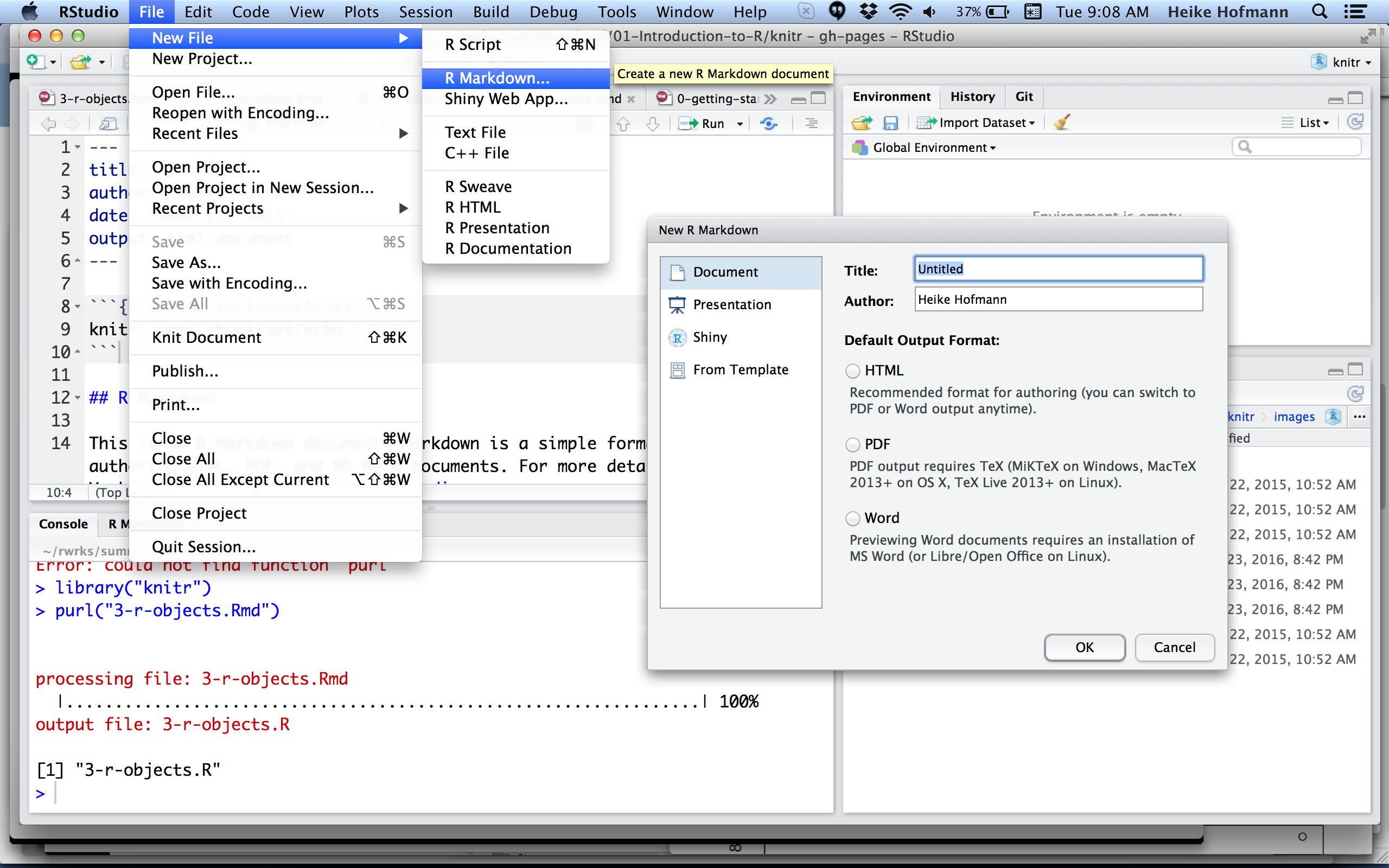 The stuff at the top of the .Rmd file (called yaml front matter) tells **rmarkdown** what output format you want.