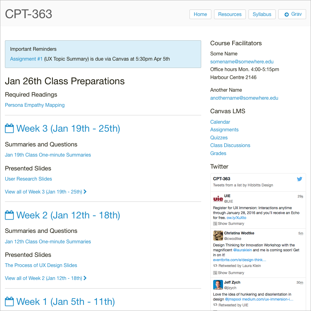 --- title: 'Grav CMS Course Companion Early Release Now Available' published: true date: '25-01-2016 00:00' continue_link: true header_image: false metadata: 'twitter:card': summary 'twitter:site': '@hibbittsdesign' 'twitter:title': 'Grav CMS Course Companion Early Release Now Available' 'twitter:description': 'Installation and configuration for my ready-to-run Course Companion, built with the open source CMS Grav.' 'twitter:image': 'http://hibbittsdesign.org/blog/posts/2016-01-25-grav-course-companion-early-release-now-available/screenshot.jpg' taxonomy: category: blog tag: - Flipped-LMS - GravCMS - MAMP - GitHub - Deploy --- _This article is now outdated. Please refer to the [Grav Course Companion Getting Started Guide](../2016-02-12-grav-course-companion-getting-started-guide)._ I am pleased (well, actually quite stoked) to announce that my ready-to-run [Course Companion](http://demo.hibbittsdesign.org/grav-course-companion-bv/), built with the open source CMS [Grav](http://getgrav.org), is now available for fellow educators to take for a test drive. ===  _Figure 1. Grav course companion screenshot. Explore the early release online at [demo.hibbittsdesign.org/grav-course-companion-bv/](http://demo.hibbittsdesign.org/grav-course-companion-bv/)_ This Course Companion is designed to accompany a face-to-face, blended or fully online university course. It also supports a [flipped-LMS approach](http://hibbittsdesign.org/blog/posts/flipped-lms-using-an-open-and-collaborative-platform) using the modern flat-file CMS Grav as an open and collaborative Web platform. # Why Flip your LMS with Grav? * To support pedagogical goals unmet by current LMS/platform * To increase capability of access, sharing and collaboration * To deliver a better student (and facilitator) experience # Why Use a Modern flat-file CMS? As an open source modern flat-file CMS, Grav offers a distinct set of advantages to Web-savvy educators looking to move beyond their institutional LMS: * Modern means... * Use of current standards (i.e. Markdown, Twig, YAML, etc.) * Modular/customizable content chunks (i.e. reuse of content) * Further separation of content (i.e. files) from presentation * Flat-file means... * No database means less (or no) IT involvement needed * Content stored in text files rather than in a database * In many cases, this translates into faster page access times * Takes full advantage of the collaborative ecosystem now available (i.e. GitHub, GitLab, etc.) * Increased portability, as moving a site now only requires simply copying files to another location # Course Companion Features * A complete ready-to-run Grav package (open source) * Blog-format, with important reminders & preparations areas * Site pages can be easily added/removed/changed * Sidebar is a simple markdown file, which can also contain HTML * URL flag to only display page content (for display within LMS). For example, [http://demo.hibbittsdesign.org/grav-course-companion-bv/blog/week-03/onlydisplaypagecontent:true](http://demo.hibbittsdesign.org/grav-course-companion-bv/blog/week-03/onlydisplaypagecontent:true) * External links are automatically opened in a new Tab/Window * Built-in support for entire site to be collaboratively maintained on GitHub * Since everything is built with Grav it can be _entirely_ customized # Quick Install (Web server only) **Pre-flight Checklist** 1. Confirm Web server PHP version (PHP 5.5.9 or higher) 1. Web server login credentials (username and password) **Installation Steps** 1. [Download](../../downloads/grav-skeleton-course-companion-site.zip) the latest release (source code available on [GitHub](https://github.com/hibbitts-design/grav-skeleton-course-companion)) 1. Unzip the package onto your desktop 1. Copy the entire Grav Course Companion folder to your Web server 1. Point your browser to the Web server folder 1. Create your site administrator account when prompted 1. And you're done! (press the icon in the Admin Panel to preview site) # Recommended Install (Desktop + Server) With the flat-file (no database) nature of Grav, there are lots of benefits of installing Grav on your computer and then having your site files mirrored onto a Web server: * Always have access to your site, regardless of Web server status * Develop and test changes to your site privately without any downtime of the live site * Store your site files on a Git service (i.e. GitHub) to better track your development and enable anywhere, anytime editing of your site * Enable others (i.e. students, fellow instructors, colleagues, etc.) to collaboratively contribute to the site, including both site content _and_ code  _Figure 2. Grav recommended install using Grav, GitHub, and Deploy to support a flipped-LMS approach._ **Pre-flight Checklist** 1. Confirm Web server PHP version (PHP 5.5.9 or higher) 1. Web server login credentials (username and password) 1. Download and install MAMP ([https://www.mamp.info/](https://www.mamp.info/)) 1. Git server account (e.g. GitHub ([https://github.com/](https://github.com)) or local GitLab or Gogs app, etc.) 1. Download and install GitHub Desktop ([https://desktop.github.com/](https://desktop.github.com/)) 1. Automatic deployment service (e.g. Deploy ([https://www.deployhq.com/](https://www.deployhq.com/)), FTPploy([https://ftploy.com/](https://ftploy.com/)), etc.) **Desktop Installation Steps** 1. Download the ready-to-run [Course Companion Skeleton Package](../../downloads/grav-skeleton-course-companion-site.zip) 1. Unzip the Grav package onto your desktop 1. Create a folder called 'MAMP Websites' in your 'Documents' folder 1. Copy the _entire_ Grav folder into your 'MAMP Websites' folder 1. Launch MAMP 1. Change the 'Document Root' MAMP preferences setting to the 'MAMP Websites' folder (within 'Documents') 1. Press the MAMP 'Start Servers' button 1. Enter 'localhost:8888' as the URL in your Web Browser 1. Choose the displayed Grav folder name 1. Create your site administrator account when prompted 1. And
