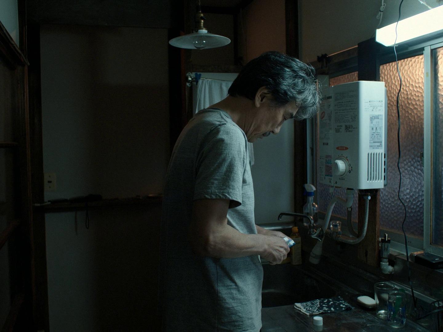 一大早天色微亮,他已經熟練地摺好被褥、刷牙洗臉、替窗台盆栽澆水,接著換上印有「[THE TOKYO TOILET](https://tokyotoilet.jp/)」的工作服。