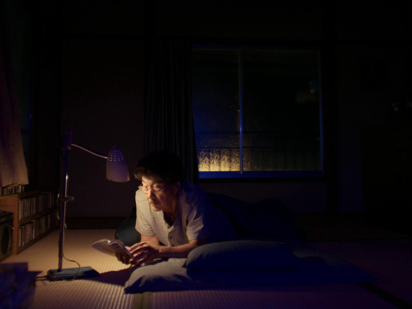 果腹之後,便返家休息。睡前,他戴著老花眼鏡,在微弱的燈光下看小說,直到睡意襲來。