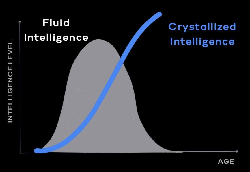 * Crystallized Intelligence represents the intelligence of _experience_. It begins to rise as Fluid Intelligence declines, with the compounding accumulation of knowledge accelerating during later career years.