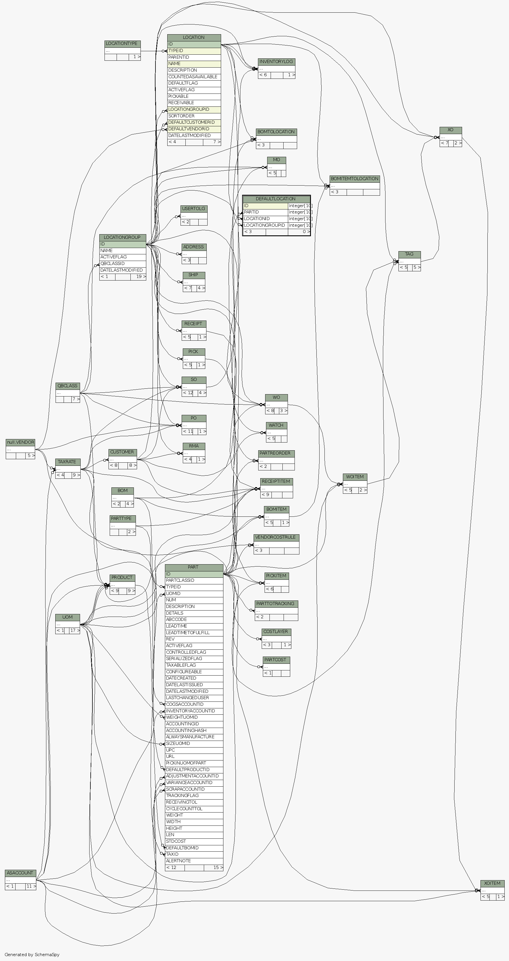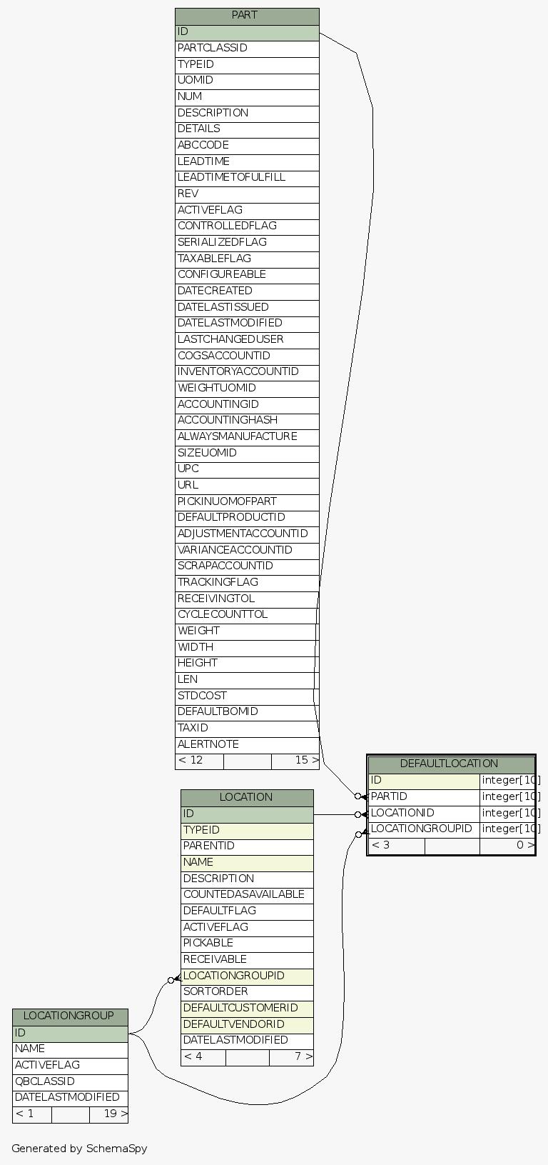 | Table /home/ilopez/git/fishbowldatadictionary/data/Fishbowl2013.5.FDB.DEFAULTLOCATION Maintains a relationship of Part & Location Group to a SpecifiC Location for Putaway and Receiving.