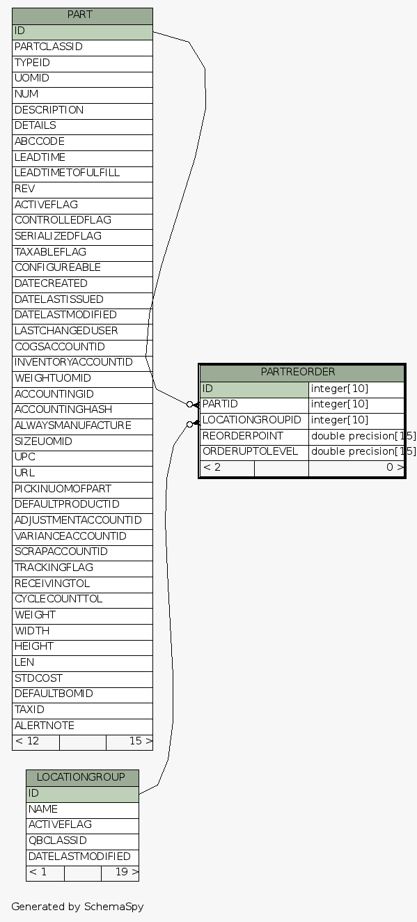 | Table /home/ilopez/git/fishbowldatadictionary/data/Fishbowl2013.5.FDB.PARTREORDER Maintains the Part Reorder Point and Order Up To Level