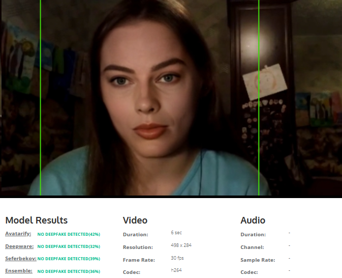 deepware.ai detects no fakes in the example video of the fake Margot Robbie.