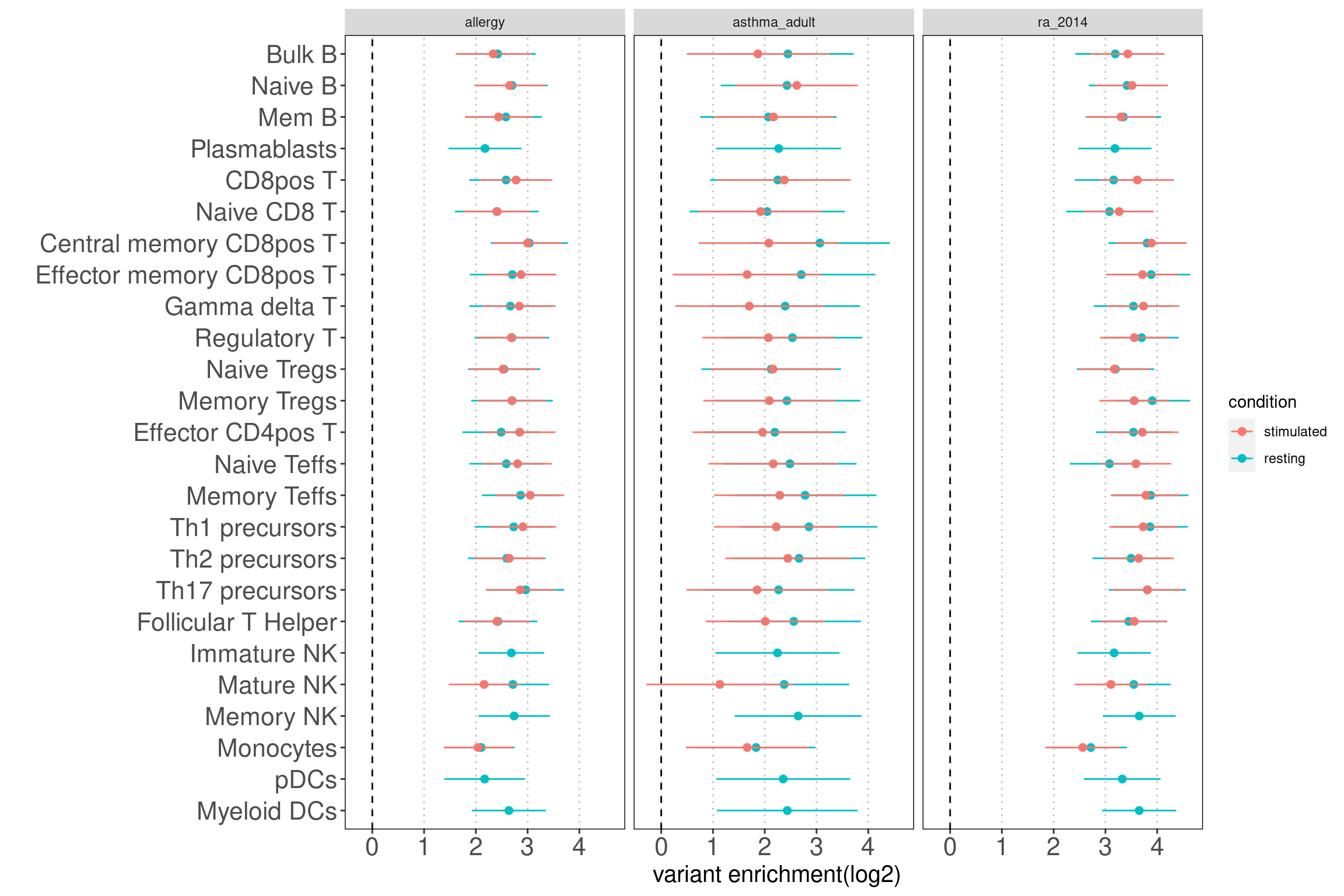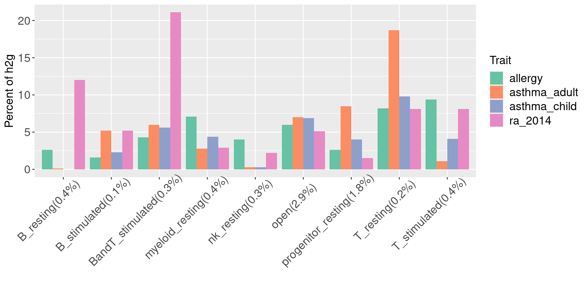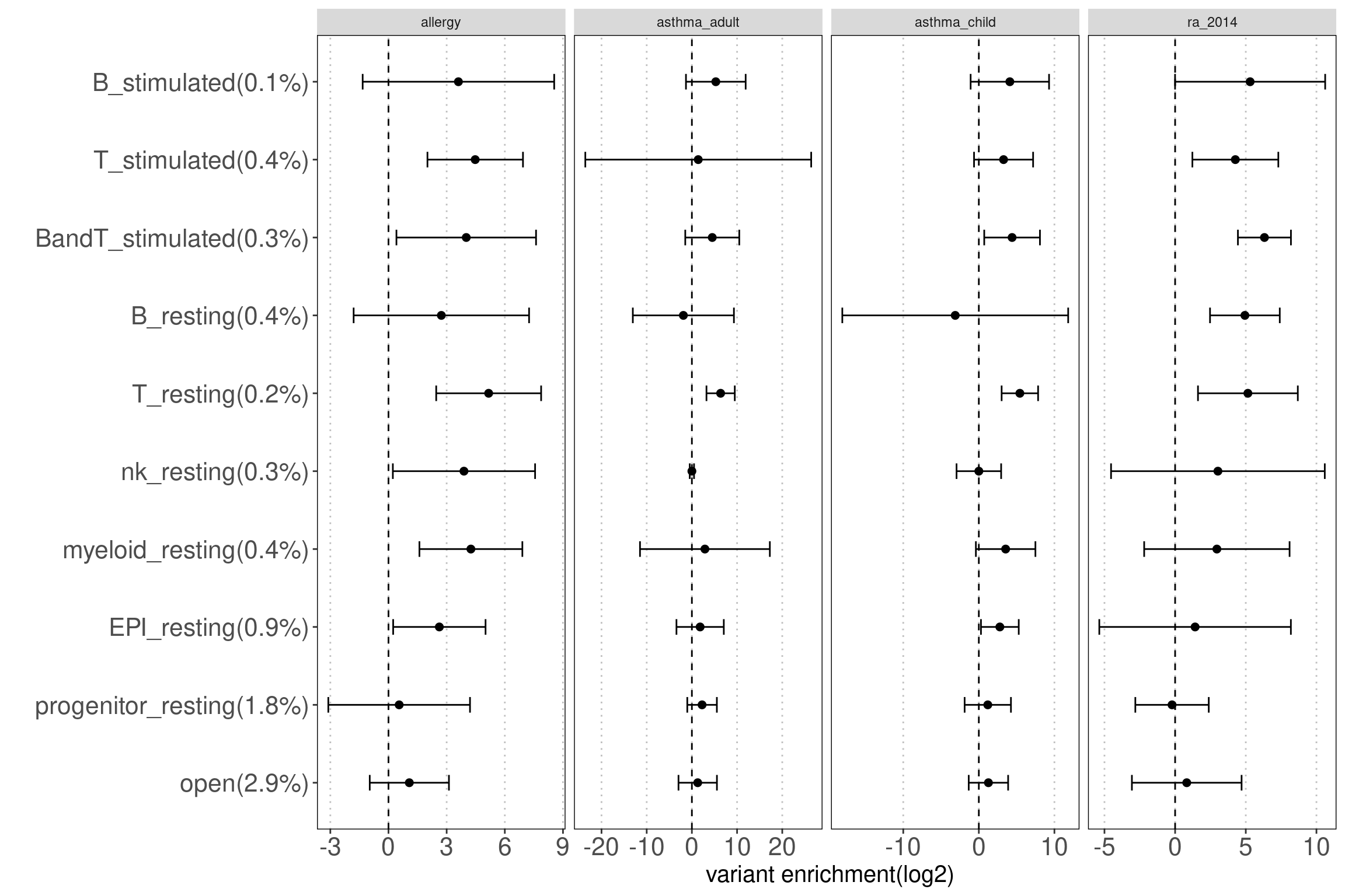 Motivation: Using disjoint groups of peaks from immune cell types to estimate separate contributions of immune components to disease heritability. These annotations are ideal predictors for the linear model used in either LDSC or TORUS to obtain unbiased enrichment estimators.