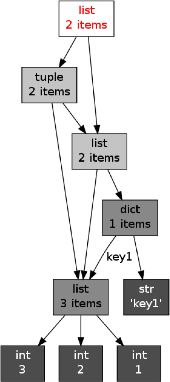 容器对象的引用可能会构成很复杂的拓扑结构,如图6-1所示。我们可以用objgraph包^(2)^{#ch2-back}来绘制其引用关系,比如: