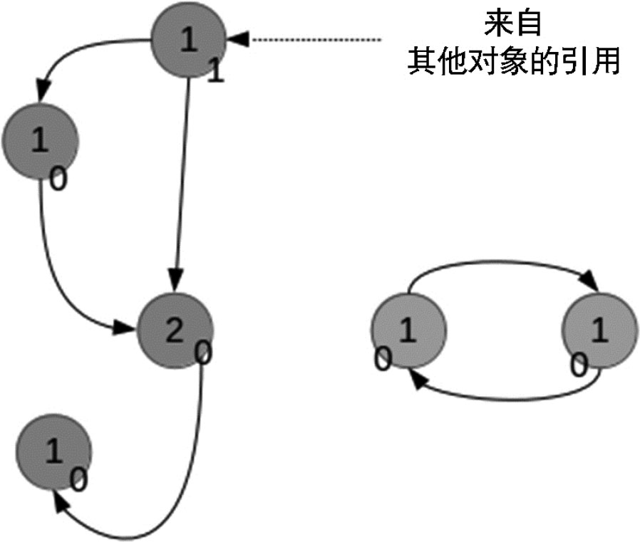引用环的存在会给上面的垃圾回收机制带来很大的困难。这些引用环可能构成无法使用,但引用计数不为0的一些对象: