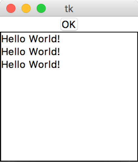 Python中内置了tkinter的图形化功能。在上面的程序中,回调函数将在列表栏中插入"Hello World!"。回调函数作为参数传给按钮的构造器。每当按钮被点击时,回调函数就会被调用,如图7-3所示。
