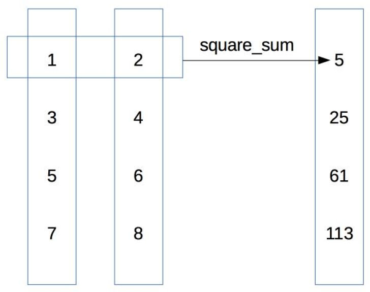 这里,map()接收了square_sum()作为第一个参数。数square_sum()要求有两个参数。因此,map()调用时需要两个可循环对象。第一个循环对象提供了square_sum()中对应于 x 的参数,第二个循环对象提供了对应于 y 的参数。它们的关系如图7-3所示。