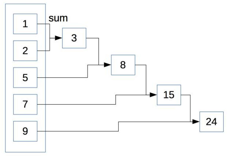 函数reduce()的第一个参数是求和的sum()函数,它接收两个参数x和y。在功能上,reduce()累进的运用传给它的二参函数。上一次运算的结果将作为下一次调用的第一个参数。首先,reduce()将用表中的前两个元素1和2做sum()函数的参数,得到3。该返回值3将作为sum()函数的第一个参数,而将表中的下一个元素5作为sum()函数的第二个参数,进行下一次求和得到8。8会成为新的参数,与下一个元素7求和。上面过程不断重复,直到列表中元素耗尽。函数reduce()将返回累进的运算结果,这里是一个单一的整数。上面的例子相当于(((1+2)+5)+7)+9,结果为24。也就是如图7-4所示过程。