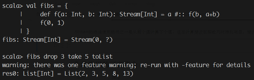 "Stream的绝佳使用场所之一是从前个值计算下个值。这在计算斐波那契数列时特别明显,斐波那契的下个元素是前两个元素的和。\n",