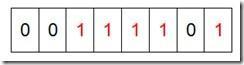 然后再处理第二个元素7,将第八位置为1,,接着再处理第三个元素,一直到最后处理完所有的元素,将相应的位置为1,这时候的内存的Bit位的状态如下: