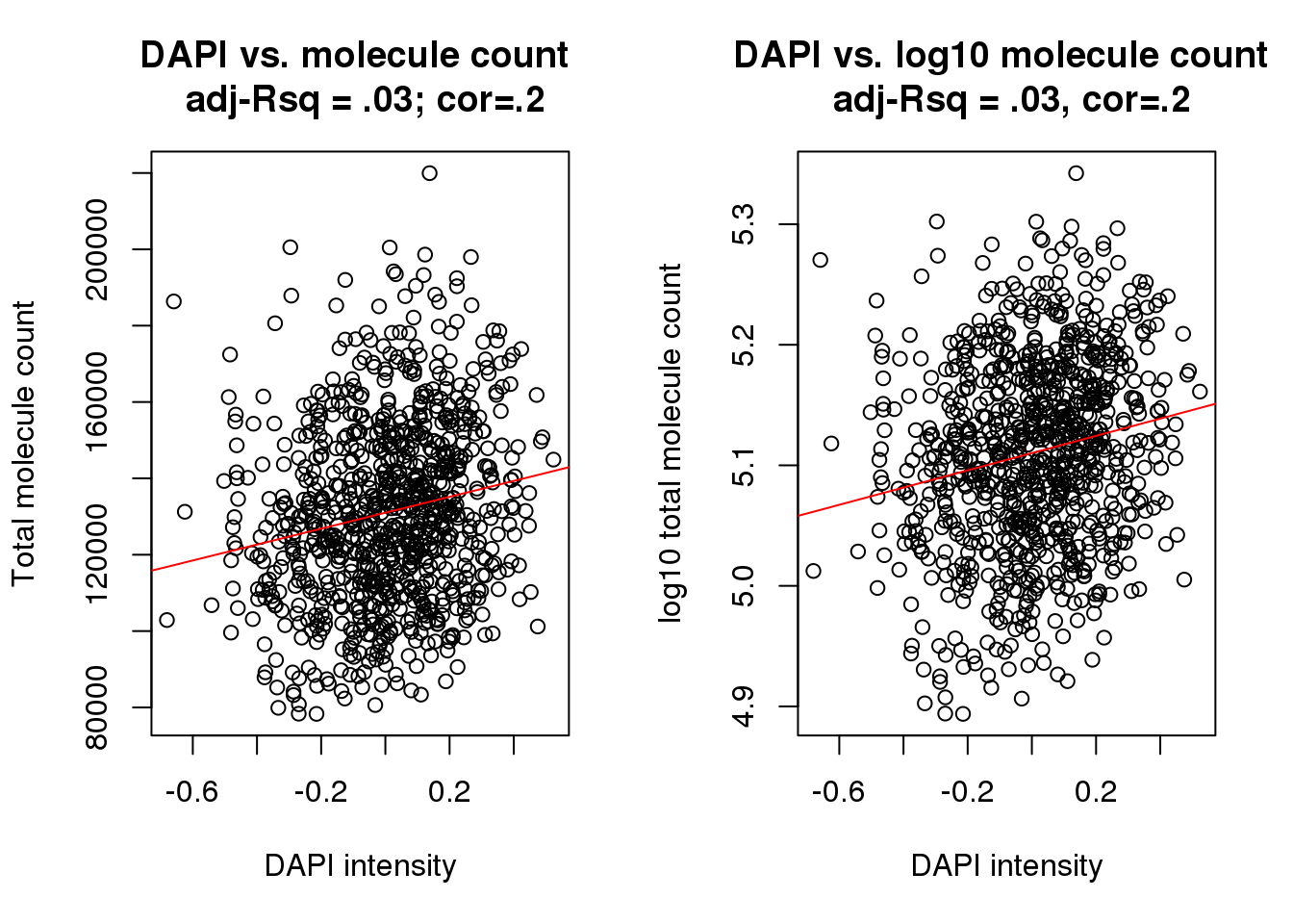 Consider lm(log10(molecules) ~ dapi). The adjusted R-squared is .04