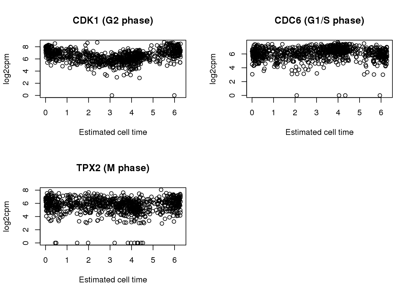 ylab = "log2cpm", xlab = "Estimated cell time")