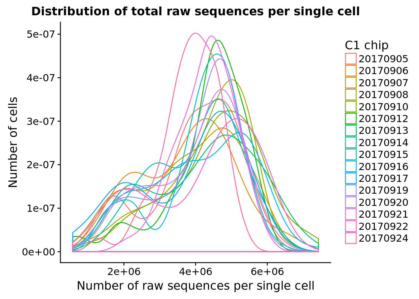 title = "Distribution of total raw sequences per single cell") +