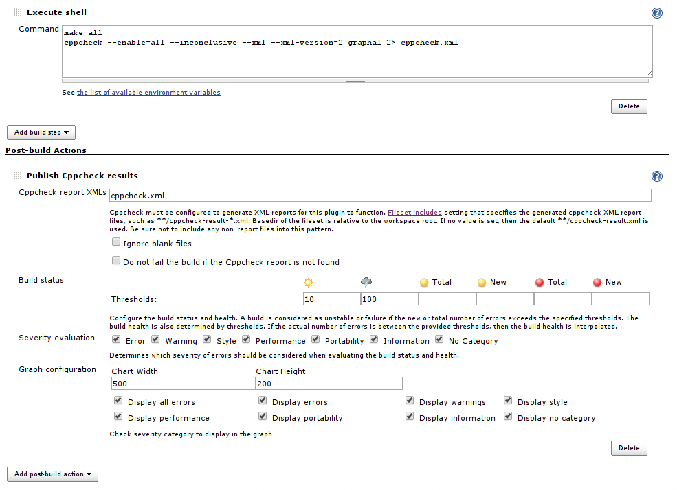 - Add **Execute shell** build step to generate Cppcheck report or